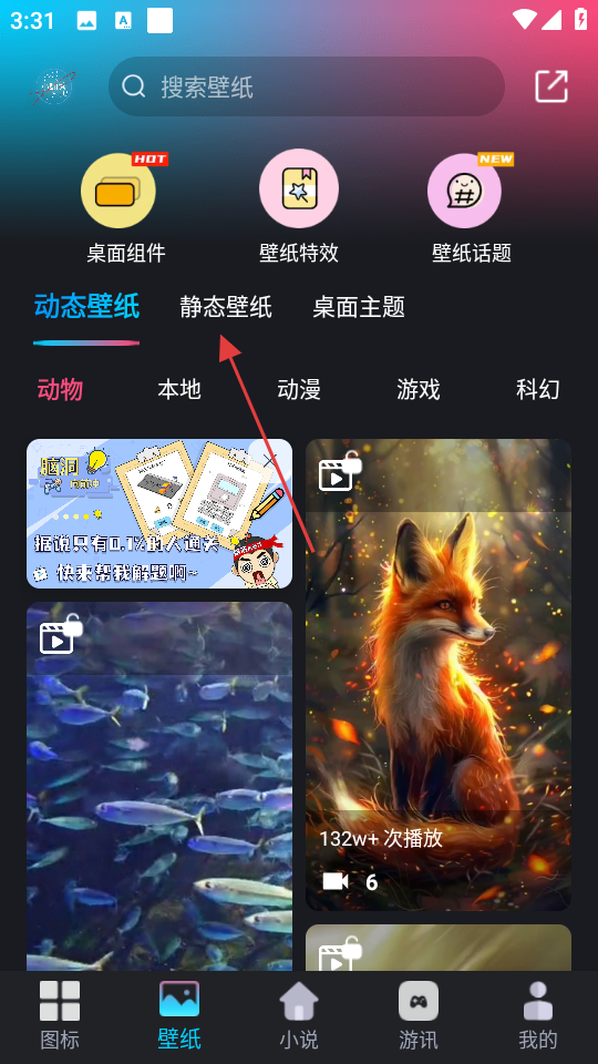 2、進入壁紙頁面后,點擊靜態(tài)壁紙選項,可查看靜態(tài)類的壁紙。