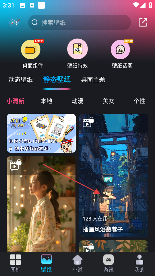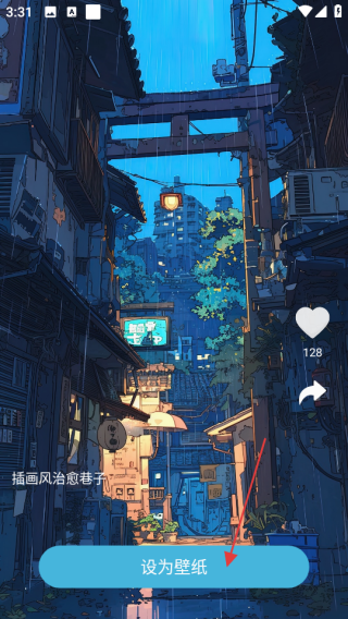 3、在靜態(tài)壁紙展示中,挑選心儀的壁紙,比如插畫風(fēng)治愈巷子這張,點擊進入其詳情頁。
