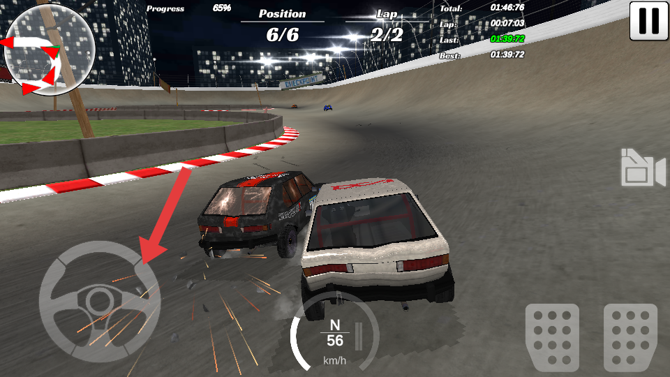 3、靈活操控模式選擇:基礎(chǔ)操作為左側(cè)移動(dòng)、右側(cè)加速后退,支持觸屏、搖桿、方向盤轉(zhuǎn)動(dòng)三種操控方式自由切換,還可切換視角與亮燈,提升碰撞時(shí)操作精準(zhǔn)度。