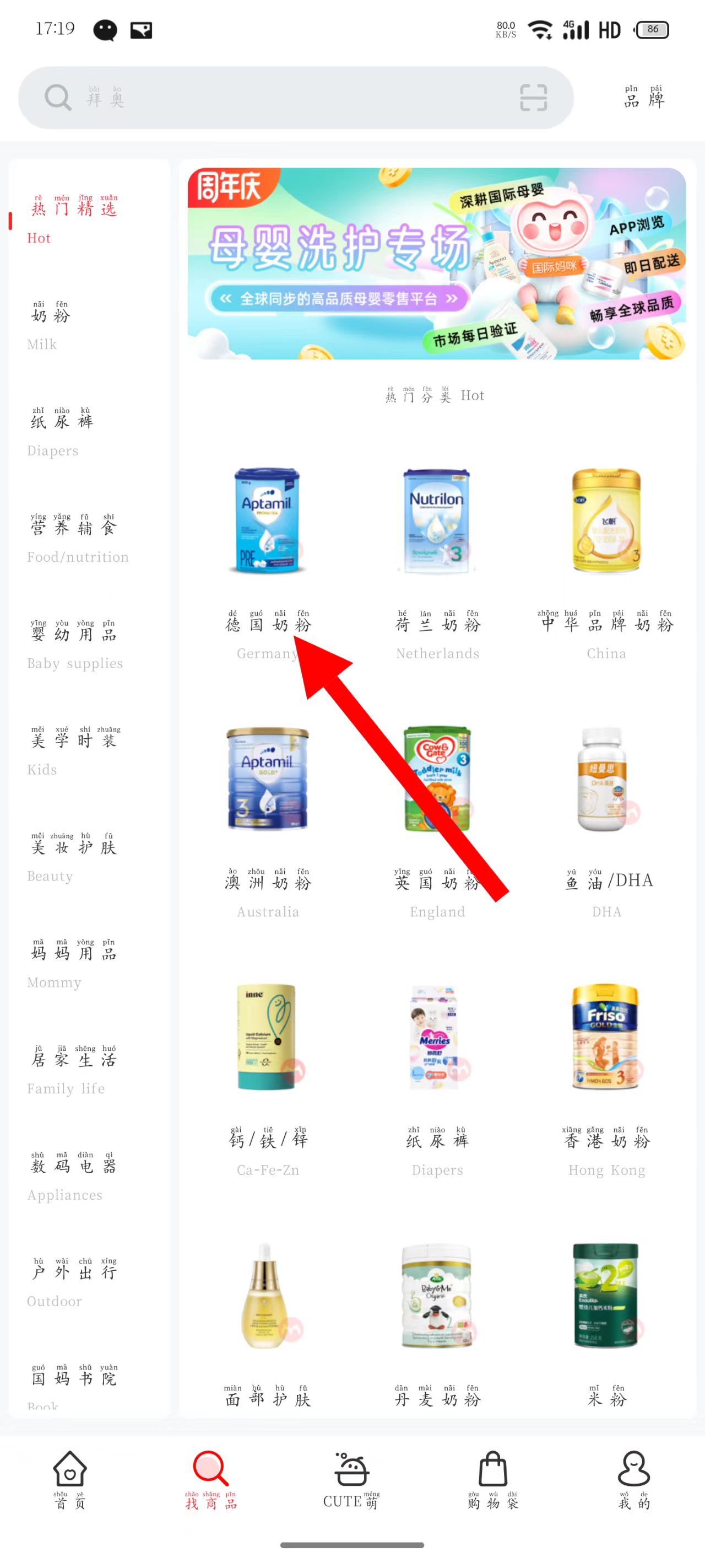 2、在商品查找頁面,點(diǎn)擊德國奶粉分類,進(jìn)入德國奶粉列表頁。