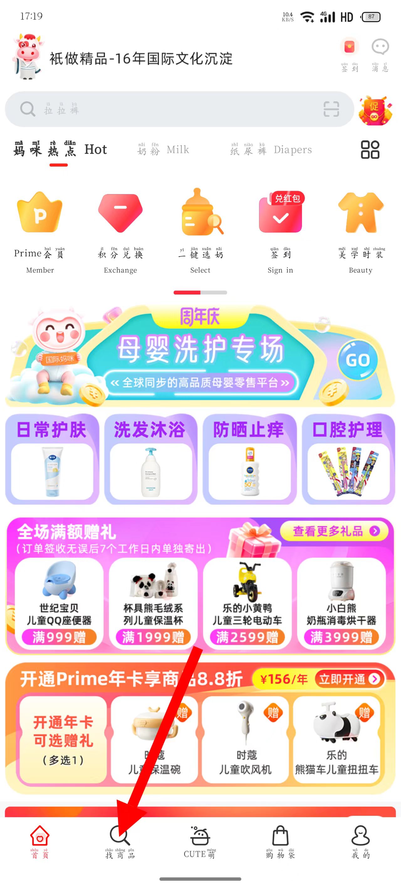 1、打開國際媽咪,點(diǎn)擊底部找商品,進(jìn)入商品查找頁面。
