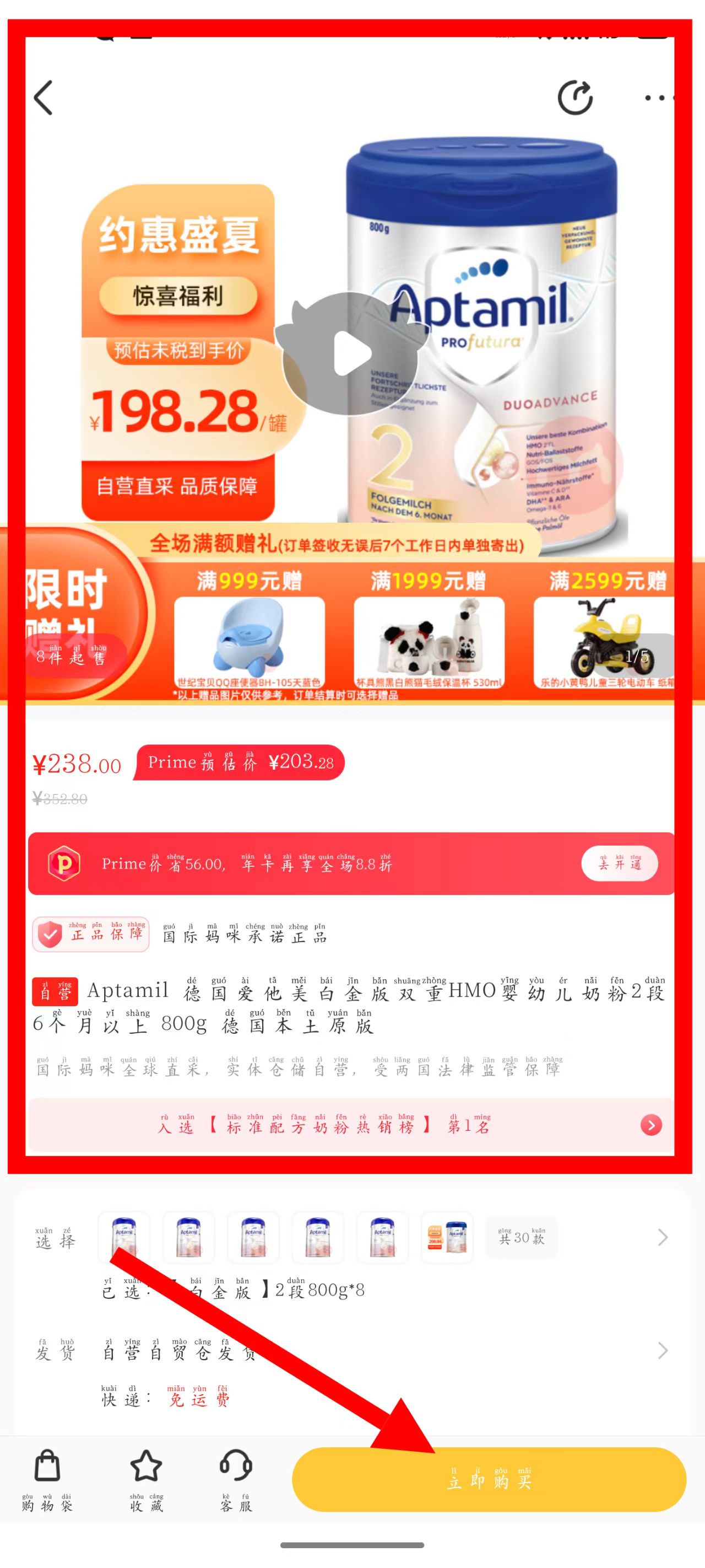 4、在商品詳情頁,點(diǎn)擊底部立即購買按鈕,即可購買該奶粉。