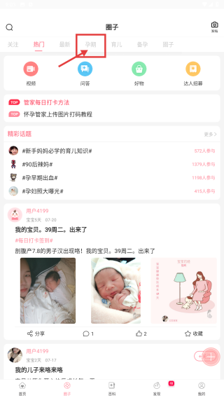 2、在圈子頁面,點擊孕期分類標簽,進入孕期相關(guān)內(nèi)容列表頁。