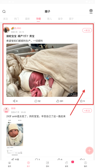 3、在孕期相關(guān)內(nèi)容列表里,選擇感興趣的帖子,點擊進入帖子正文頁。