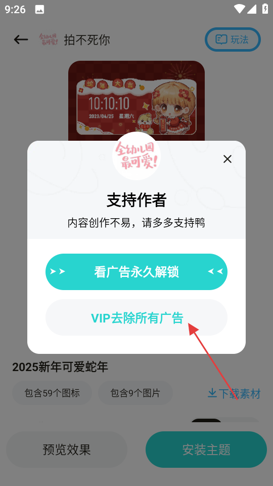 4、若彈出支持作者彈窗,可選擇VIP去除所有廣告來(lái)繼續(xù)安裝主題。