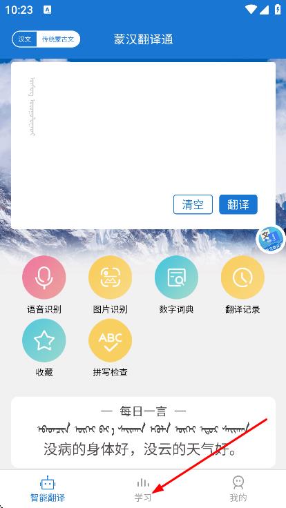 1、打開蒙漢翻譯通,點(diǎn)擊底部學(xué)習(xí),進(jìn)入學(xué)習(xí)頁(yè)面。