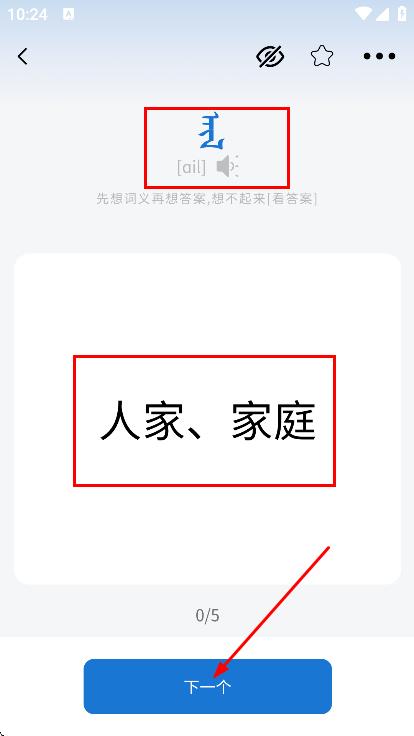 4、進(jìn)入詞匯學(xué)習(xí)界面,點(diǎn)擊下一個(gè),可學(xué)習(xí)下一個(gè)詞匯。