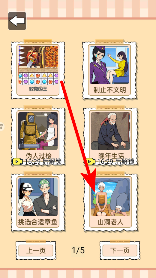 1、選擇關(guān)卡時,能看到救救國王、制止不文明、山洞老人等關(guān)卡選項,點擊想要挑戰(zhàn)的關(guān)卡,即可進入該關(guān)卡的游戲場景。