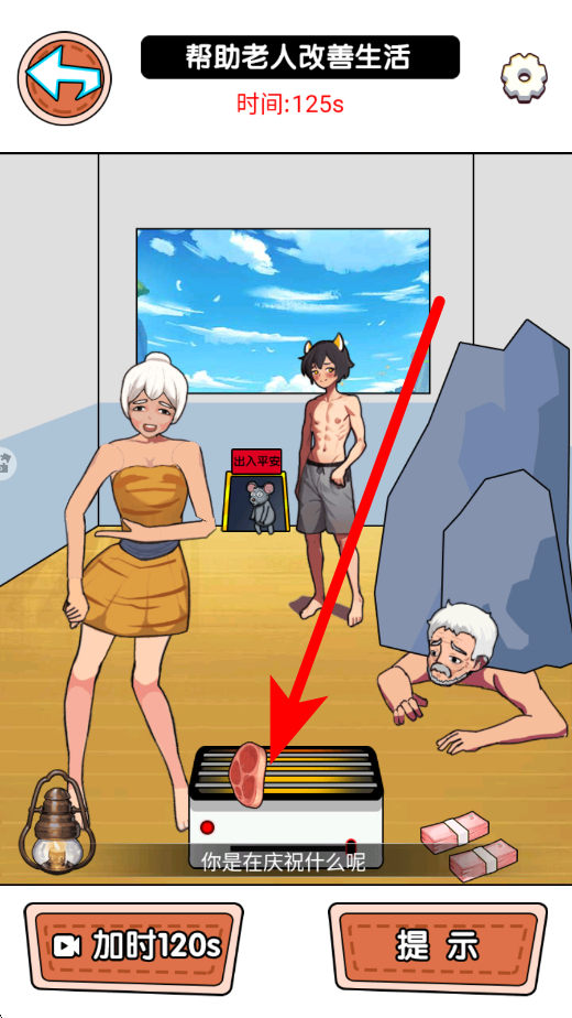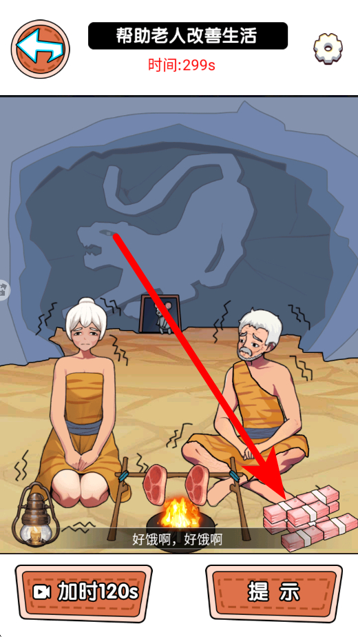 3、同時也可使用肉類,將肉進行手指拖動幫助老人他們,以此來達成關(guān)卡內(nèi)的相關(guān)任務(wù)的要求,助力玩家游玩任務(wù)的完成。