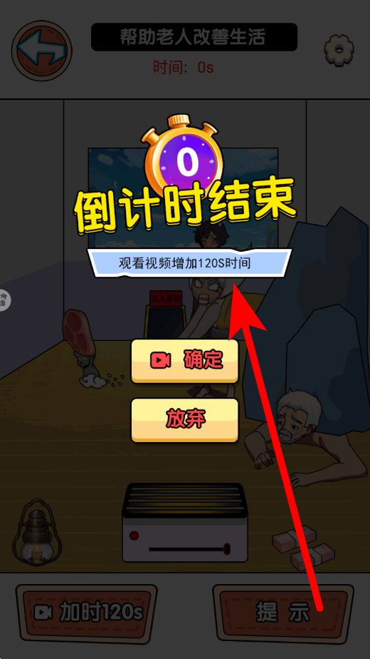 4、若挑戰(zhàn)失敗倒計時結(jié)束的提示,此時可選擇放棄,結(jié)束本次挑戰(zhàn),也可選擇觀看視頻來增加時長,獲得更多時間繼續(xù)嘗試通關(guān)。