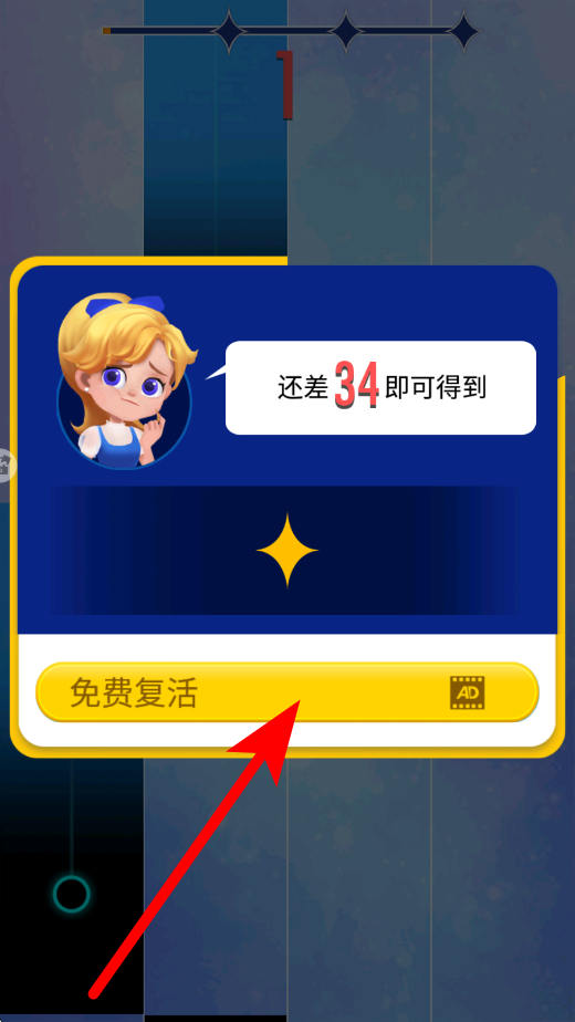 2、彈奏過程中若出現(xiàn)失誤導致挑戰(zhàn)受阻,可選擇免費復活,通過相應操作就能重新繼續(xù)當前歌曲的彈奏,爭取更好的表現(xiàn)。