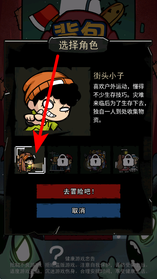 1、進入后,在角色選擇界面,可挑選初始角色,不同角色有不同特點,選好后點擊去冒險吧,開啟冒險之旅。