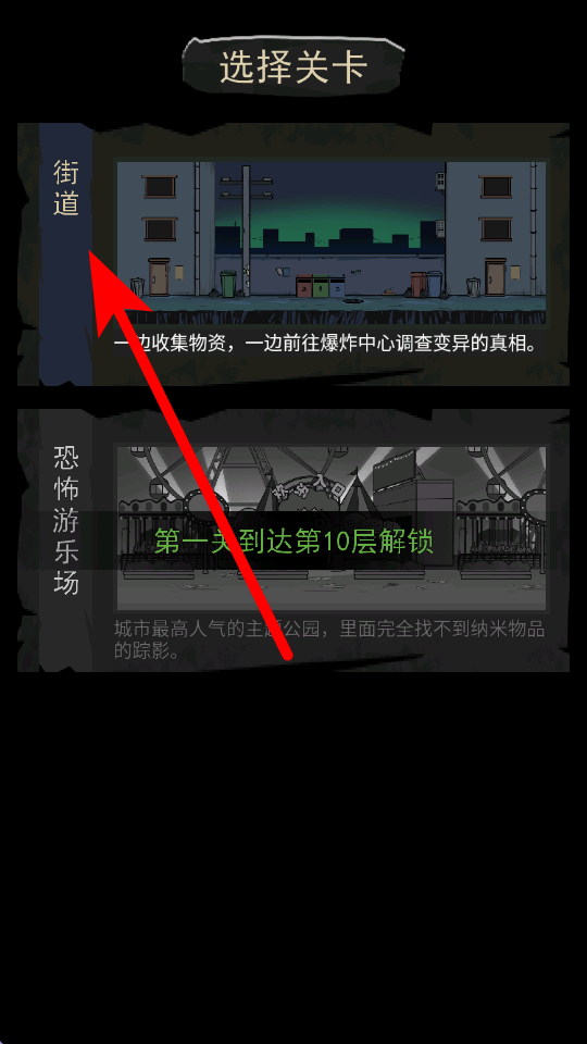 2、來到關卡選擇界面,初始可選擇街道關卡,在該關卡中,要一邊收集物資,一邊朝著爆炸中心前進,調(diào)查變異的真相。