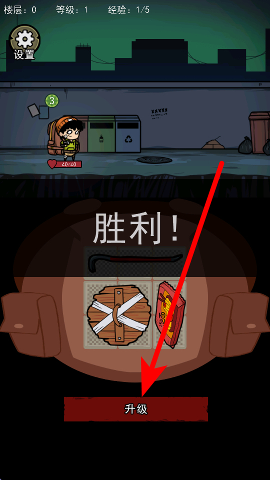 4、成功擊敗敵人后,會出現(xiàn)勝利提示,此時點擊升級按鈕,可提升背包空間,增加背包空間使放下更多的道具,為后續(xù)更艱難的冒險做準備。