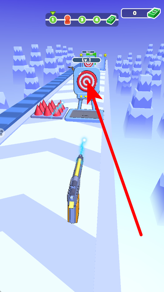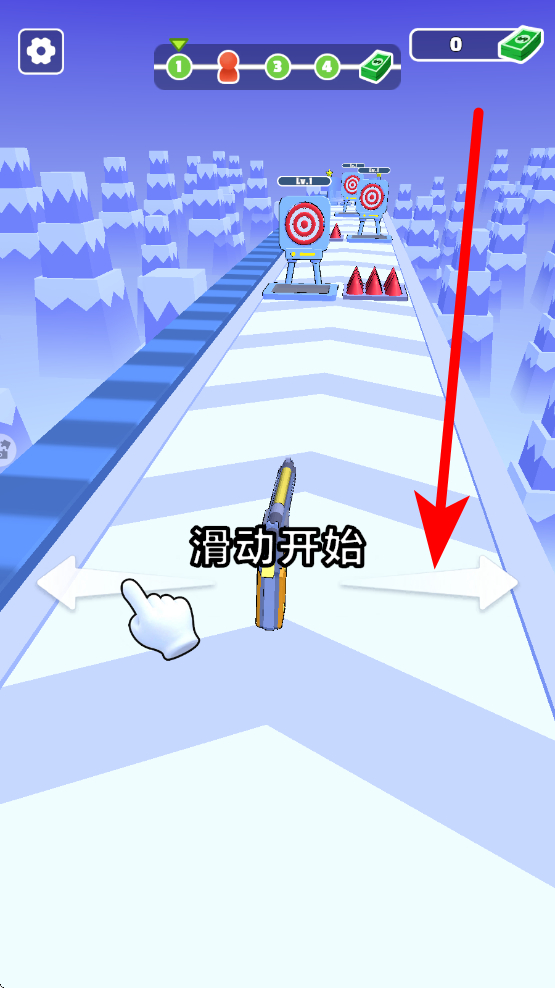 1、玩家體驗(yàn)時(shí),進(jìn)入游戲界面,看到滑動(dòng)開始的提示,通過(guò)滑動(dòng)操作,讓武器開始在賽道上移動(dòng),開啟射擊沖刺的射擊的過(guò)程。