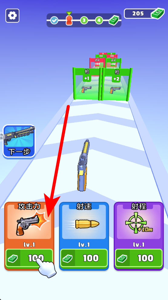 4、升級(jí)方面利用通關(guān)獲得的獎(jiǎng)勵(lì),可對(duì)武器的攻擊力、射速、射程等屬性進(jìn)行升級(jí),提升武器的射擊能力,讓后續(xù)的射擊沖刺更輕松順利。