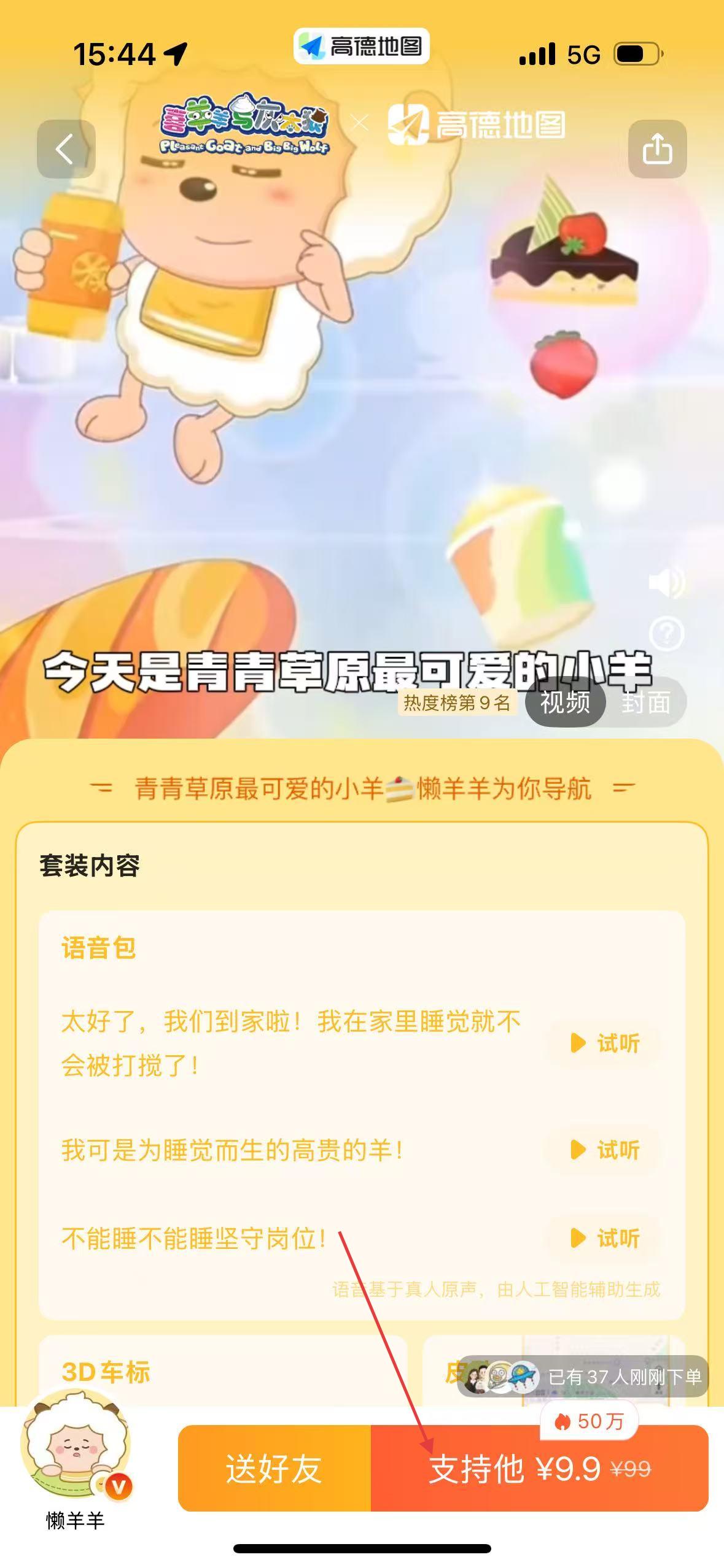 4、在語音包詳情頁,點擊支持他按鈕進行購買,即可設(shè)置該語音包。