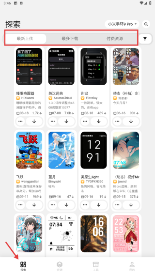 1、在探索界面有最新上傳,最多下載和付費(fèi)資源類型。