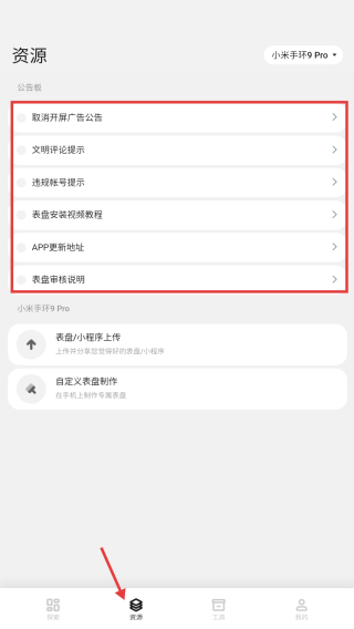 2、點(diǎn)擊資源頁面,有取消開屏廣告公告、文明評(píng)論提示、違規(guī)賬號(hào)提示功能。