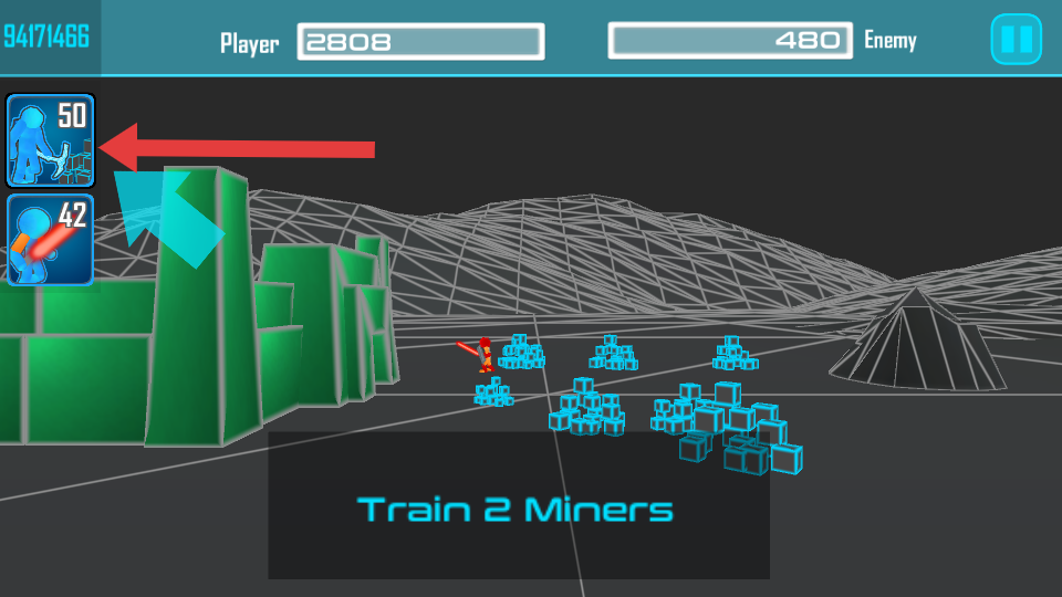 2、點(diǎn)擊箭頭指向的礦工訓(xùn)練圖標(biāo),訓(xùn)練礦工單位,礦工可用于采集資源,為后續(xù)訓(xùn)練戰(zhàn)斗單位、提升戰(zhàn)力提供資源支持。