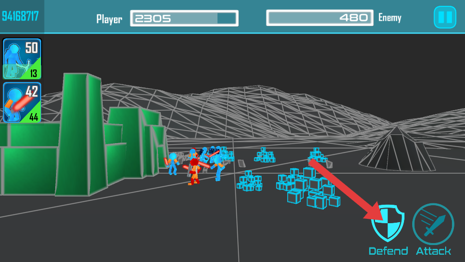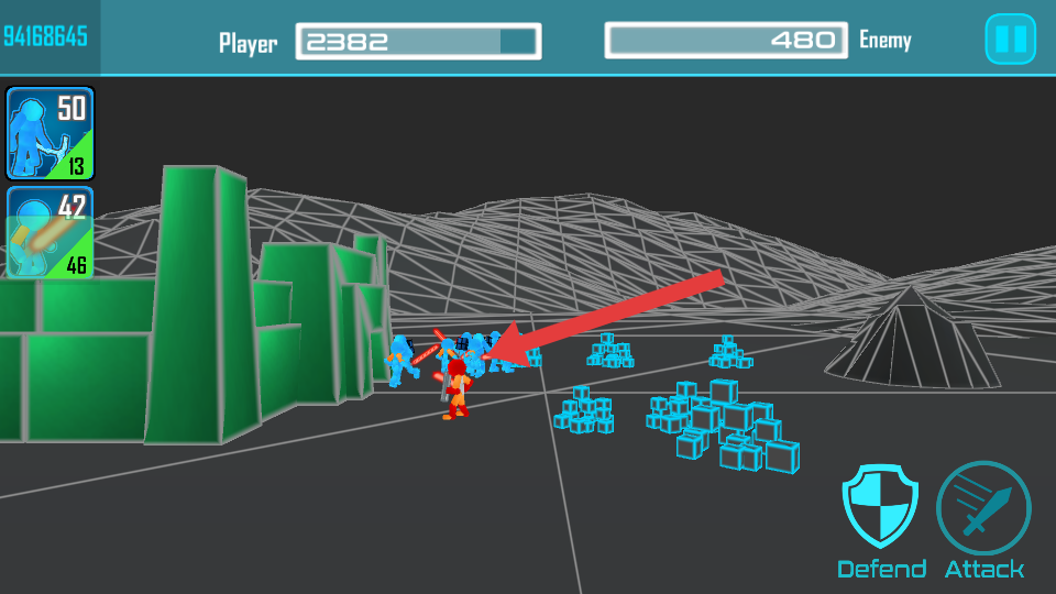 4、在戰(zhàn)斗過程中,若敵人發(fā)起強(qiáng)勢攻擊,點(diǎn)擊箭頭指向的Defend防御按鈕,讓己方單位進(jìn)入防御狀態(tài),減少受到的傷害。