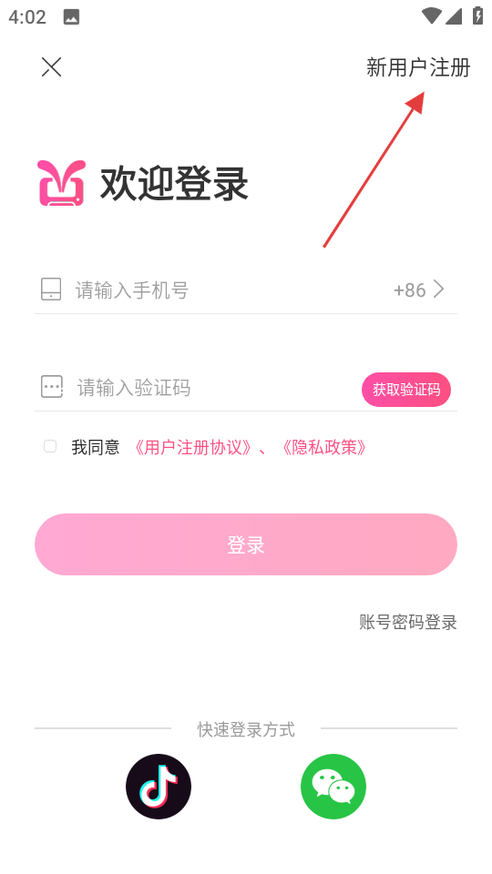 3、在登錄頁面,點擊新用戶注冊選項,進(jìn)入注冊頁面。