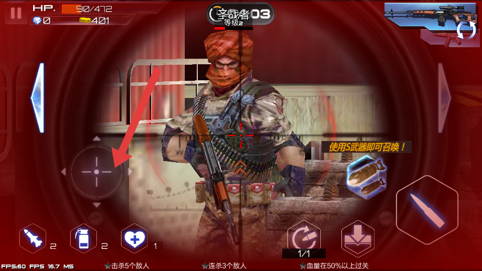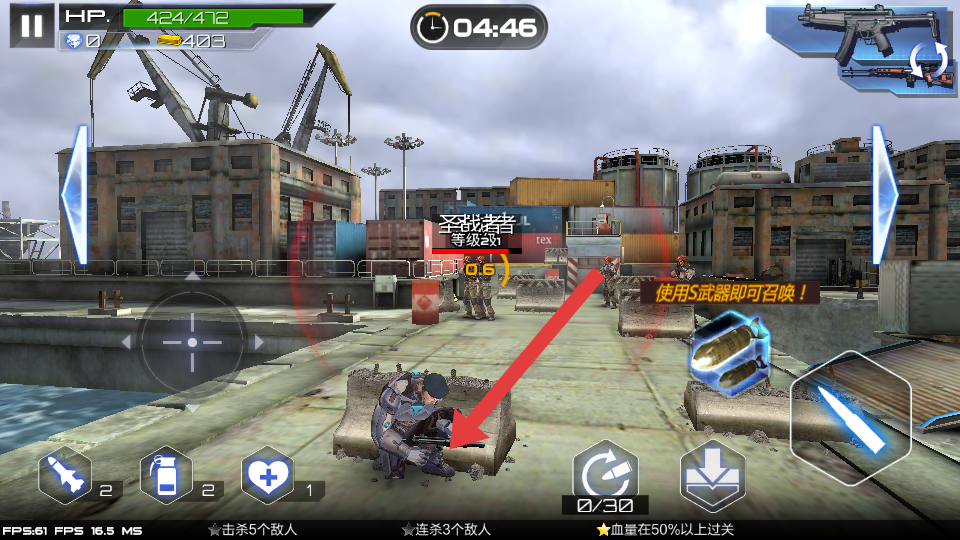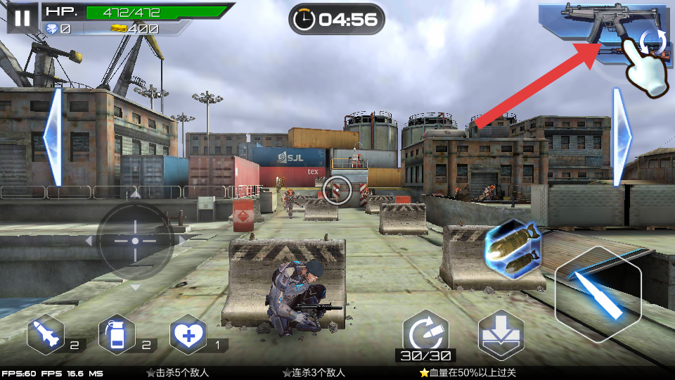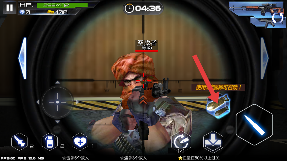 2、遭遇敵人時,點擊箭頭指向的投擲物圖標(biāo),使用投擲物對敵人造成范圍傷害或干擾,為自身創(chuàng)造有利的射擊環(huán)境。