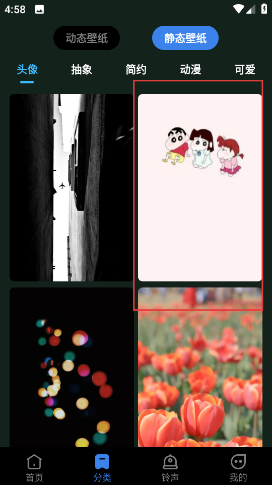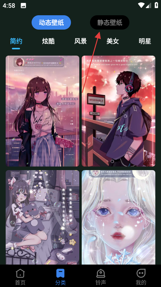 2、在分類頁(yè)面,點(diǎn)擊靜態(tài)壁紙選項(xiàng),進(jìn)入靜態(tài)壁紙頁(yè)面。