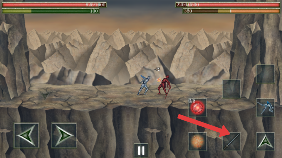 4、與敵人遭遇時(shí),點(diǎn)擊箭頭指向的劍形攻擊按鍵,發(fā)動(dòng)近戰(zhàn)攻擊,對(duì)敵人造成傷害,展開戰(zhàn)斗對(duì)決。