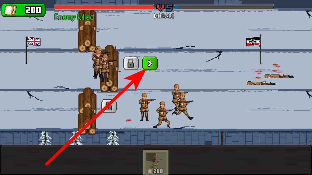 2、點擊綠色箭頭翻過障礙物,當部隊遇到障礙物阻擋時,點擊綠色箭頭按鈕,部隊就能翻過障礙物,繼續(xù)向敵方陣地推進,開展進攻。