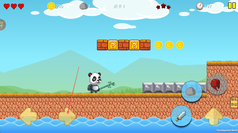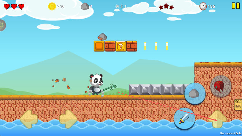 3、點(diǎn)擊跳躍按鈕,熊貓?zhí)鹩弥褡佑|碰磚塊,獲取金幣等物品。