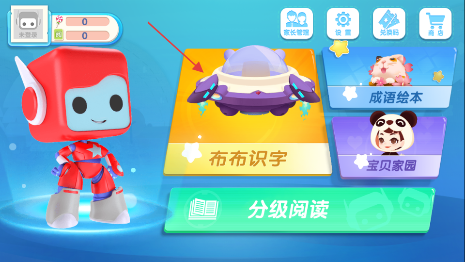 1、在軟件主界面,點(diǎn)擊布布識字按鈕,進(jìn)入識字相關(guān)場景。