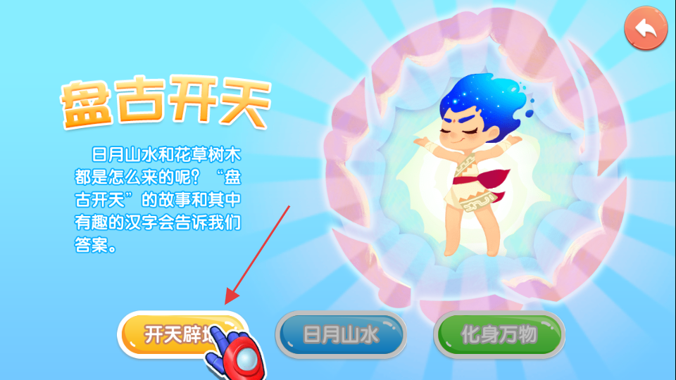 3、進(jìn)入盤古開天頁面后,點(diǎn)擊開天辟地按鈕,開啟相關(guān)故事內(nèi)容。