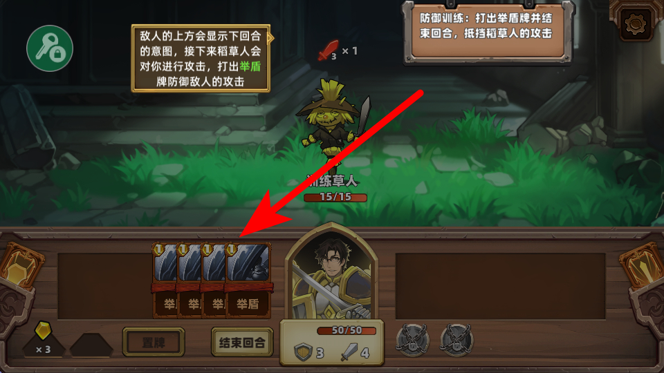 2、戰(zhàn)斗時,敵人上方會顯示下回合意圖,當敵人要攻擊時,可打出舉盾類卡牌,以此防御敵人的攻擊,保障自身安全。
