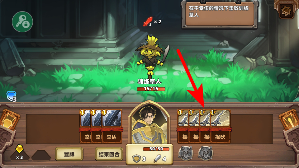 3、除了防御卡牌,還有揮砍等攻擊類卡牌,在合適的時機打出這些攻擊卡牌,能對敵人造成傷害,推進戰(zhàn)斗進程。