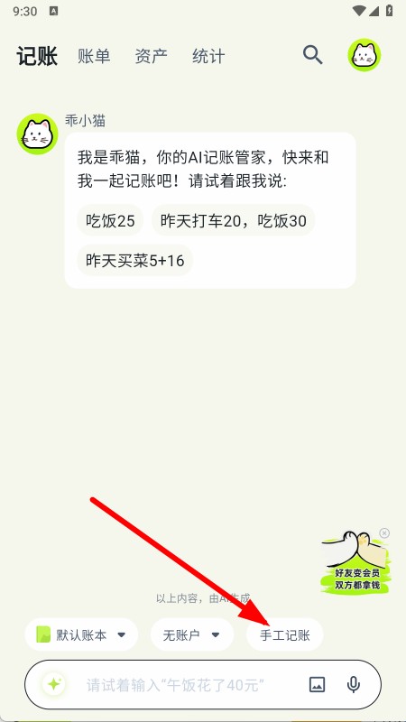 1、打開乖貓記賬APP,點(diǎn)擊手工記賬選項(xiàng),進(jìn)入支出分類選擇頁面。