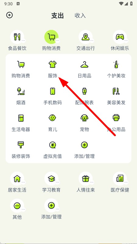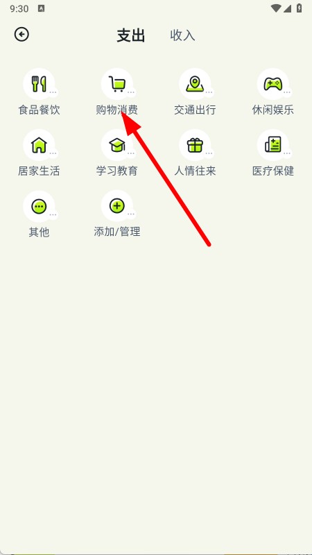 2、在支出分類選擇頁面,點(diǎn)擊購物消費(fèi)分類,進(jìn)入其下的子分類頁面。