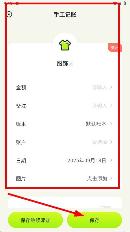 4、在輸入金額、備注,選擇賬本、賬戶、日期,添加圖片后,點(diǎn)擊保存按鈕,即可完成服飾類消費(fèi)的手工記賬。