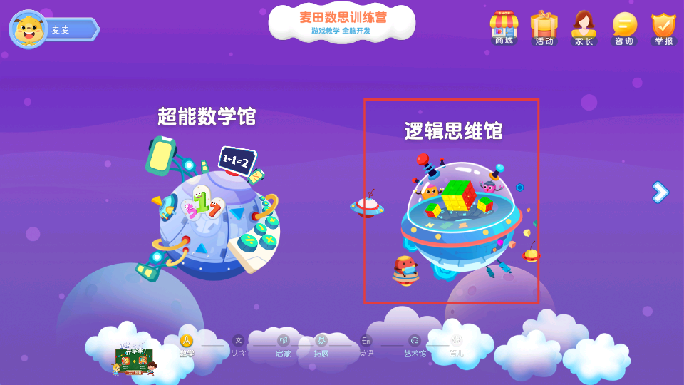 2、在麥田數(shù)思訓(xùn)練營(yíng)頁(yè)面,點(diǎn)擊邏輯思維館,進(jìn)入邏輯思維學(xué)習(xí)場(chǎng)景。