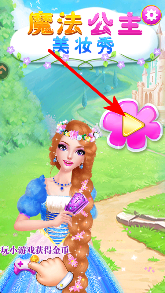 1、進(jìn)入游戲時(shí),點(diǎn)擊帶有三角形的開始圖標(biāo),就能開啟魔法公主美妝秀的裝扮之旅,進(jìn)入到相關(guān)的裝扮場(chǎng)景中。