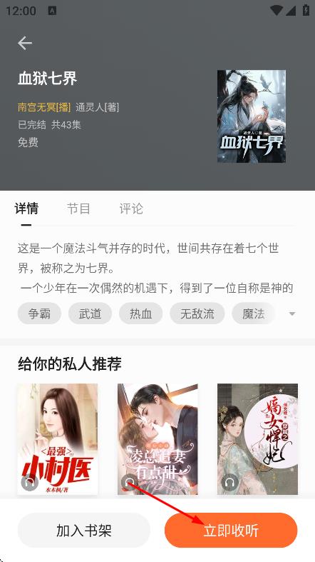 3、在作品詳情頁面,點擊立即收聽,開始收聽作品。
