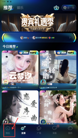 1、打開娛樂類APP,點(diǎn)擊底部陪玩選項(xiàng),進(jìn)入陪玩服務(wù)相關(guān)頁面。