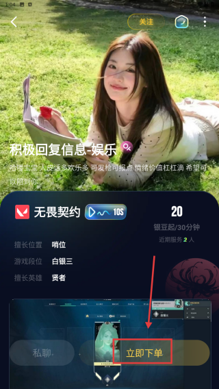 4、在詳情頁,點(diǎn)擊立即下單按鈕,即可發(fā)起陪玩服務(wù)的下單操作。