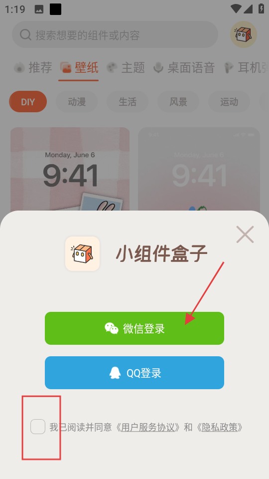 4、選擇登錄方式如微信,并勾選協(xié)議后完成登錄即可設(shè)置壁紙。