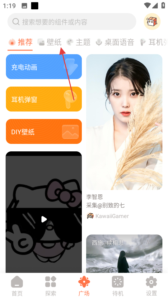 2、在廣場頁面,點(diǎn)擊壁紙選項(xiàng),進(jìn)入壁紙選擇界面。