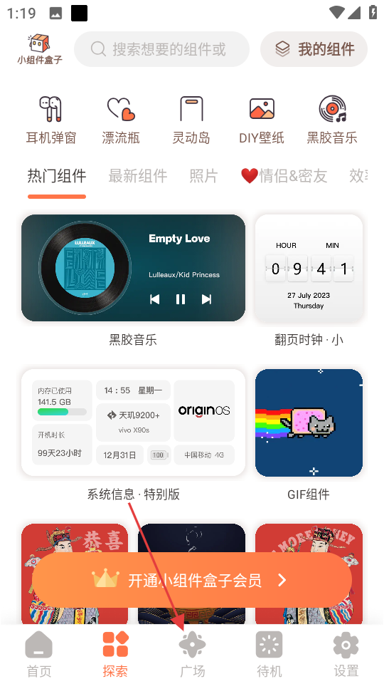 1、在小組件盒子的探索頁面,點(diǎn)擊底部廣場按鈕,進(jìn)入廣場頁面。