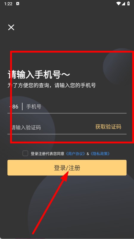 3、進(jìn)入登錄注冊(cè)頁(yè)面后,輸入手機(jī)號(hào),點(diǎn)擊獲取驗(yàn)證碼并輸入收到的驗(yàn)證碼。