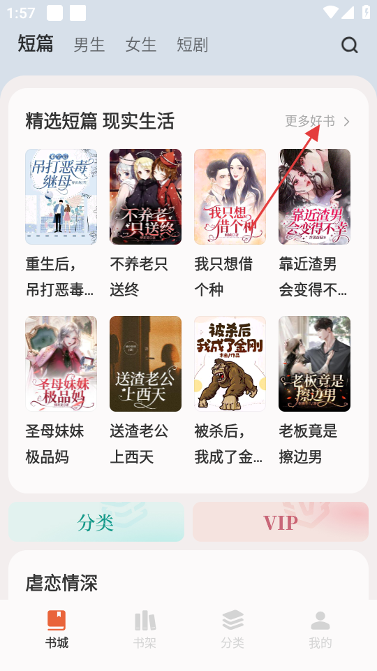1、在書城頁面,點(diǎn)擊更多好書,進(jìn)入短篇精選頁面。