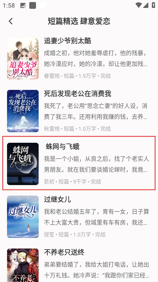 2、在短篇精選頁面,選擇蛛網(wǎng)與飛蛾,進(jìn)入該書詳情頁。