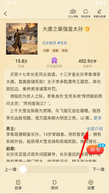 3、在小說(shuō)詳情頁(yè),點(diǎn)擊全部介紹按鈕,查看小說(shuō)的詳細(xì)介紹信息。